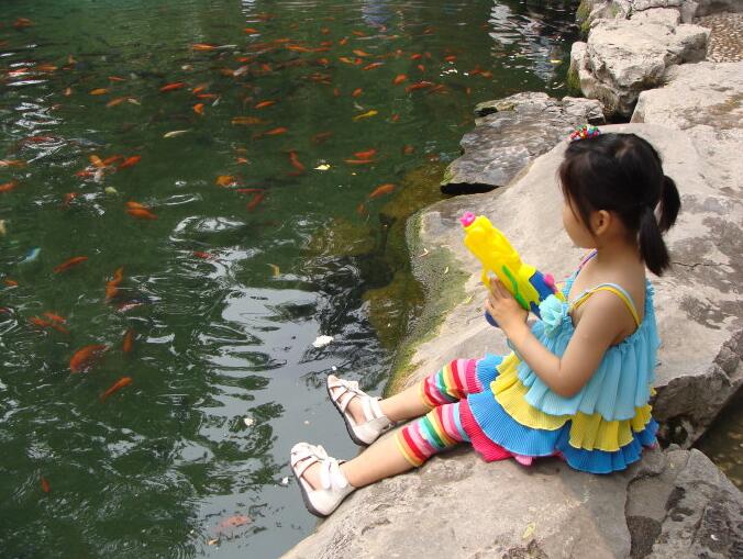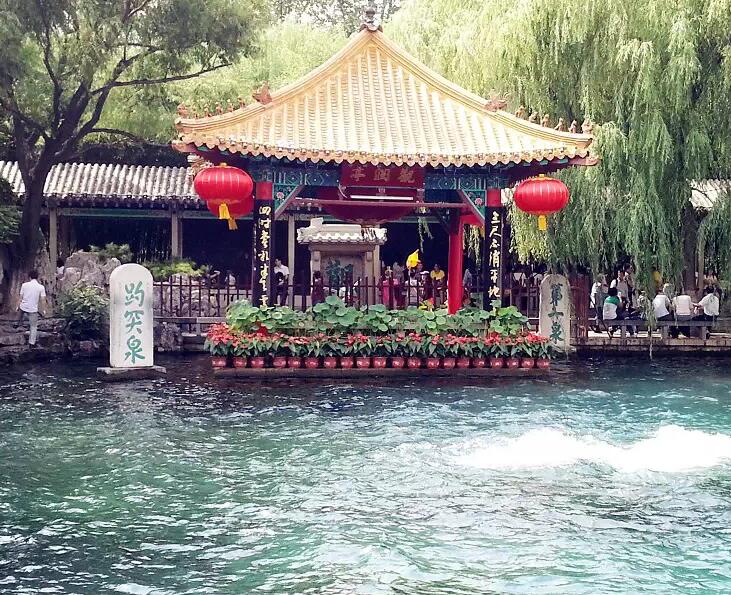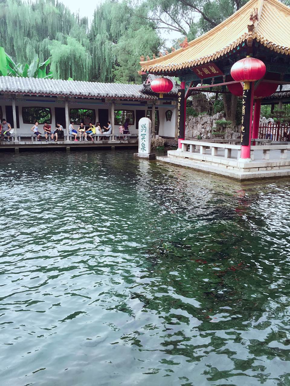 下午行程是趵突泉,天空开始下起了下雨,不过不影响行程。话说三十年前我来过,但印象中仅有一池死鱼,也许是有这么张照片的缘故吧~此番带大美小荔枝来,趵突泉的园子里风景很是不同了,没有干涸的池子,清澈见底的水池里养着肥硕的金鱼,真有炖了的冲动~小荔枝此行的目的很是明确,玩水玩水,没有水还有什么意思~整个园子我们就在找可以下水的地方,还微信咨询着小羊妈妈~泉水很凉,但抵挡不了小孩子们的热情,满满的都是人。