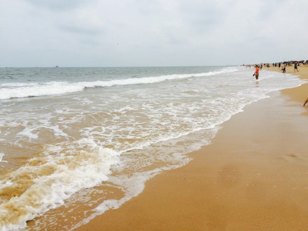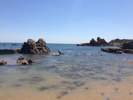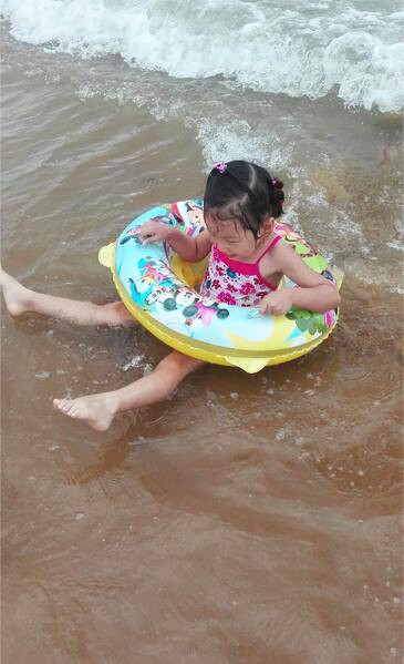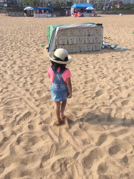 隧道大巴到的金沙滩,以为会很远,其实很方便~真的是不虚此行,海水干净,沙滩也还算细~小荔枝走到边上就迫不及待的要下去,换好衣服一刻也不在上面待,乍着胳膊就往海里冲~金沙滩的海浪有些大,基本不能游泳,她就指挥着爷爷进去踩浪,还一劲儿让往深处走,玩的很是嗨皮~中午一块乌云过来,哗啦啦下了一场不小的雨,幸好我租了帐篷,100块钱值了~