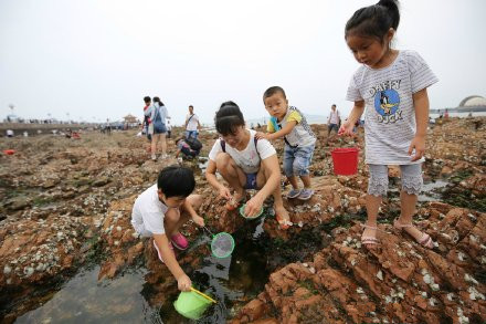 午睡后,打车到了栈桥,附近有海滩,小荔枝拎着小桶挖螃蟹捡小虾。