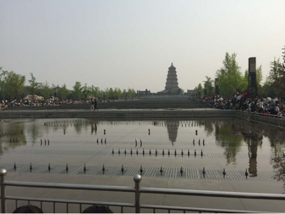 远处的是大雁塔,这是喷泉开始前,四周围满了观看的人