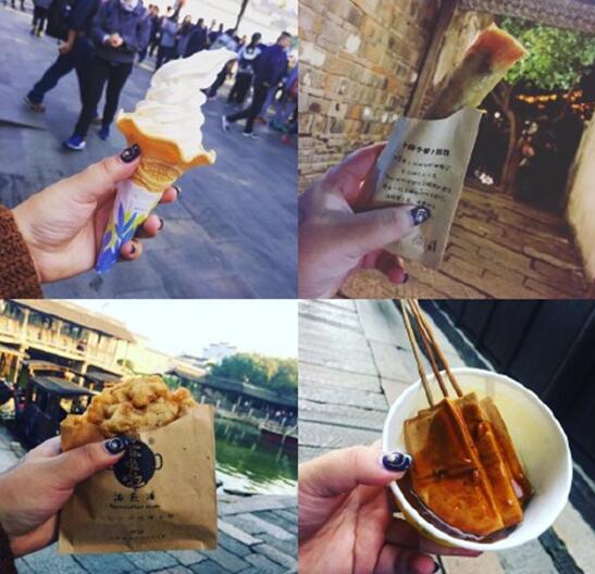 东栅离西栅走路的话20分钟,西栅到东栅有免费的班车,到晚上也开。检票进西栅之后,可以坐船进古镇。古镇内西栅河一侧全部是方便、商店,还有各种各样的民宿,另一侧全是景点。有染布坊,手工艺品店,中国江南特产,拍起来特别好看。再然后就是排队买吃的,俩人嘴巴从来都没停过。