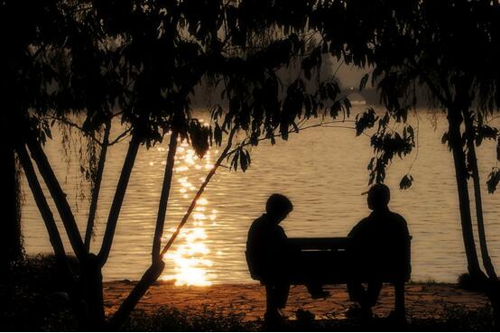 这老两口不得了,西湖那么大,他俩非要绕一圈,不过我们这次本来也是为了陪二老散心,好吧,随你走。老两口走累了,就在岸边的长椅休息。