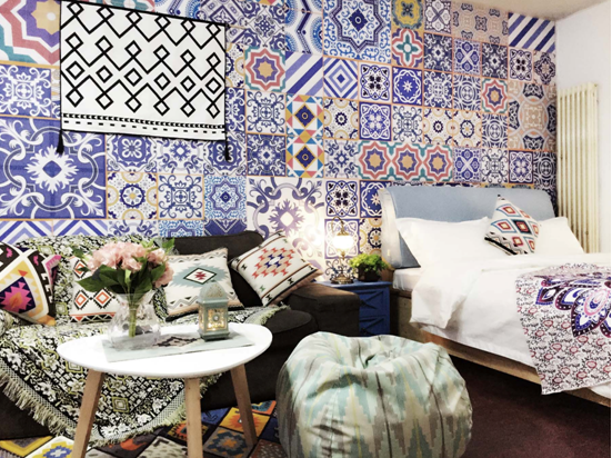 民宿韵味十足,很好地展示了民族风的主题。永不过时的碎花墙纸,搭配几何形状的壁画,点缀出客厅的异域风情。浅绿色的榻榻米沙发堆积着家庭的温暖,厨房墙壁是鲜艳跳跃的颜色,点亮了民族风格的情调,人住进这里,就像是住进了少数民族的家里。