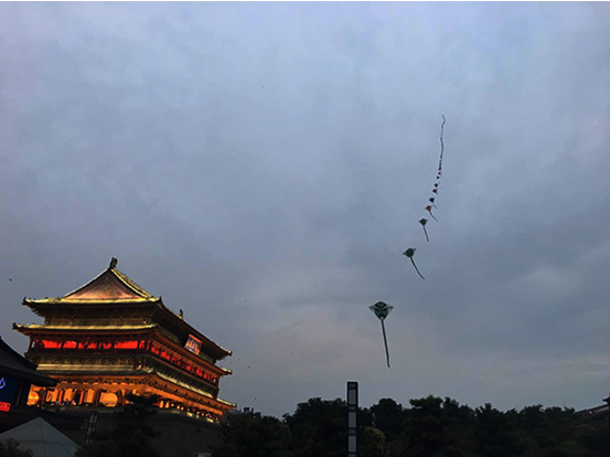 附近就是大雁塔。傍晚广场上有人在放风筝。风筝越飞越高,好像飞进了白云里。随着夜幕降临,大雁塔四处的灯都亮了,在夜色的笼罩下,显得神圣而璀璨。