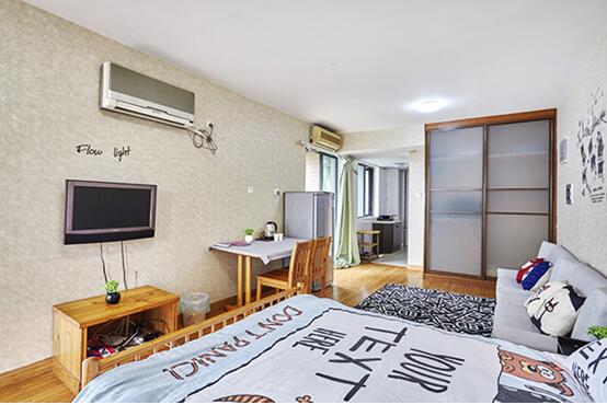 房间是敞开式结构,一室一厅一卫,家具是原木的,搭配个性的床品,给人感觉很小资。