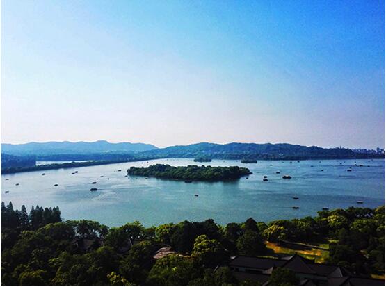 爬到塔上,视野果然不一样,西湖景色尽收眼底。在阳光的照射下,小瀛洲岛像是一个绿色明珠,镶嵌在西湖波光闪闪的湖中心。远处的山峦,和葱葱郁郁的绿树,笼罩在淡淡的水蒸气之下,仿佛仙境一样。