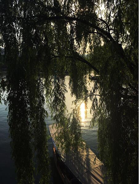 吃过晚饭,我们去了大川经常光顾的茶馆。老奶奶沏上最地道的龙井茶,端上一盘香瓜子。在月牙高挂的河边,我们一边喝茶,一边吃瓜子,一边欣赏夜景,一边聊天,真的太舒服了。