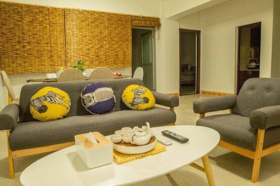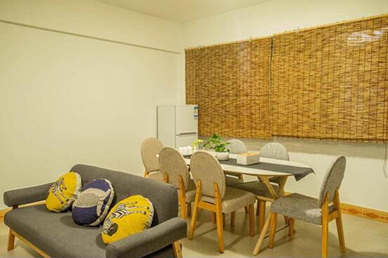 民宿有客厅,餐厅和厨房。抱枕、沙发颜色统一都是暖色系,茶几、餐桌等等都是原木材质,就连民宿所有的灯光都采用了暖色调的光源。当你走进来的时候,会自然放松,能够快乐享受独属于你们的度假时光。