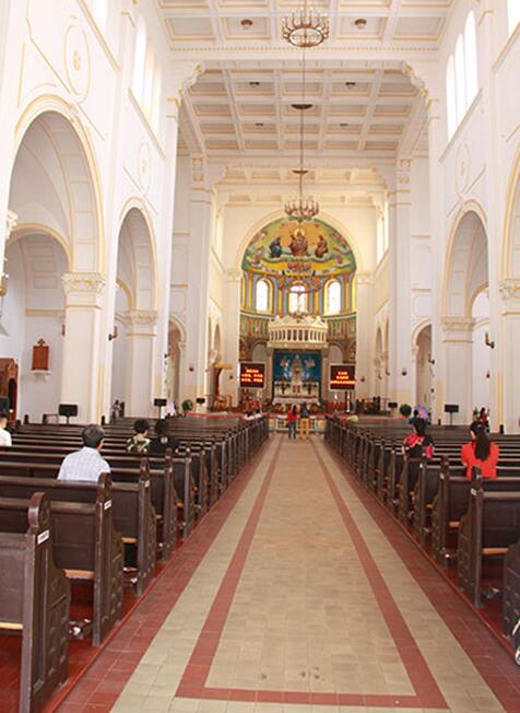 最后一天的行程只有半天。浙江路天主教堂和栈桥离我们住的地方都很近。早晨吃过早饭之后去天主教堂。教堂前面依然是看到许多拍婚纱照的(看来这是个结婚/拍婚纱照的好季节啊)。教堂需要门票,每人10元,像我们这种没有宗教信仰的人,只是感受一下教堂的氛围。因为不是周一,所以并没有大批做礼拜的人,但还是看到了两位虔诚的教徒在教堂里认真地祷告着什么。