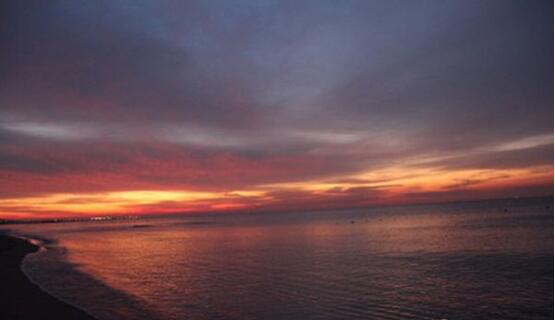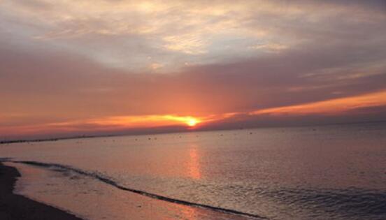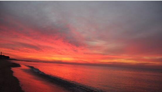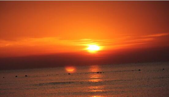 凌晨四点四十左右,天空就像着了火一般,第一次在海边看日出,海天一片红色,太阳像颗火球跳出海平面,很壮观,很美,像一幅画。我们五个人被强烈的震撼到。就连房东阿姨都说,这也是她看这么多次日出以来,最美的一次。