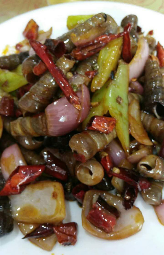 炒钉螺做法(这个稍微麻烦一些),在做之前要先用硬物将钉螺的尖砸掉,然后用水轻煮一下,开锅就捞出来,接下来就是炝锅、炒辣椒,然后将钉螺放进去翻炒,加入洋葱、尖椒等调味材料,再翻炒几下,出锅即可。顺道提一嘴,吃海螺的方法是,先用嘴使劲吸细口,在翻过来,使劲吸粗口,然后嫩肉就到嘴里了,超级好吃。