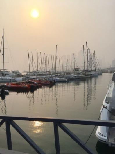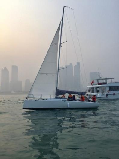 旁边不远处就有出海的帆船,几个游客已经坐上去开走了,有点雾蒙蒙的天。平静的海面竟然泛起琉璃一样的光。