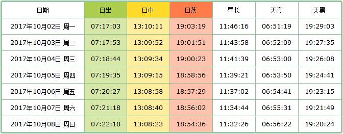 奉上黑马河日出的国庆日出表供参考。