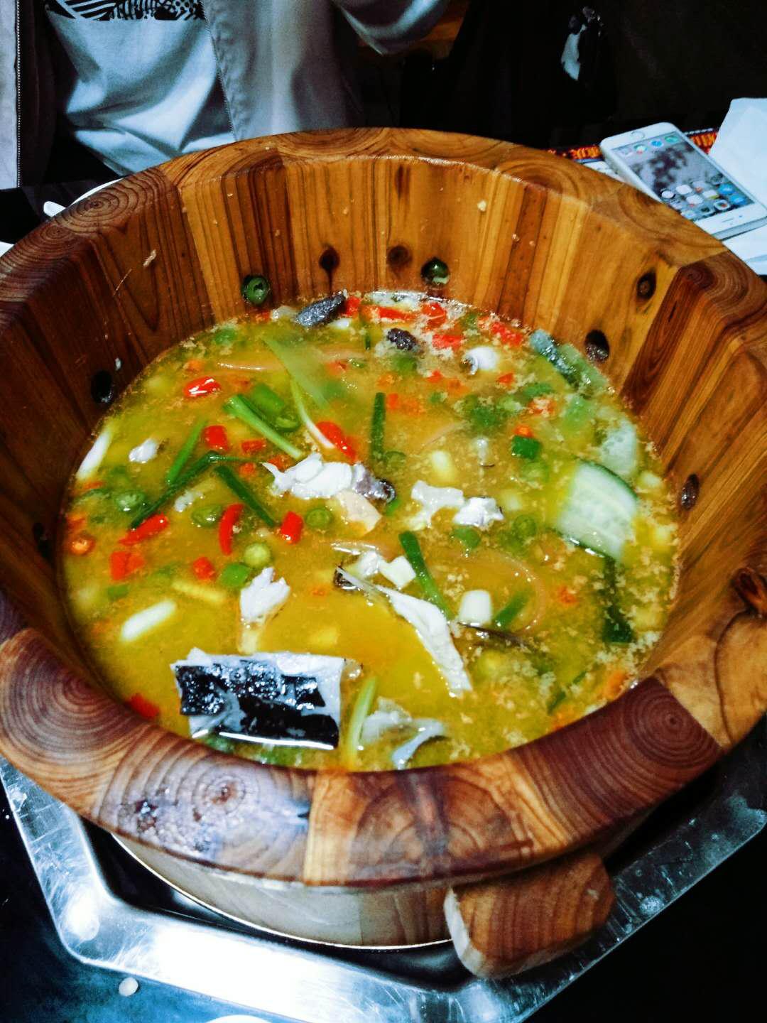 木桶底部放着石头,然后把熬好的汤倒进去,再把鲜鱼片倒进去,不用火,炙热的石头可以把鱼肉煮熟,然后再等鱼肉的时候可以先喝碗汤,为了喝汤,我们要的是清汤锅,而事实证明,一点也不清汤,是麻辣的,但是炒鸡好喝啊!