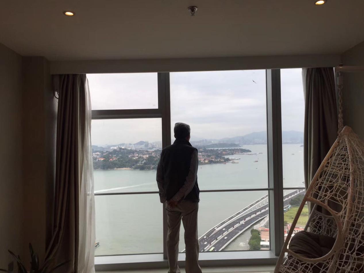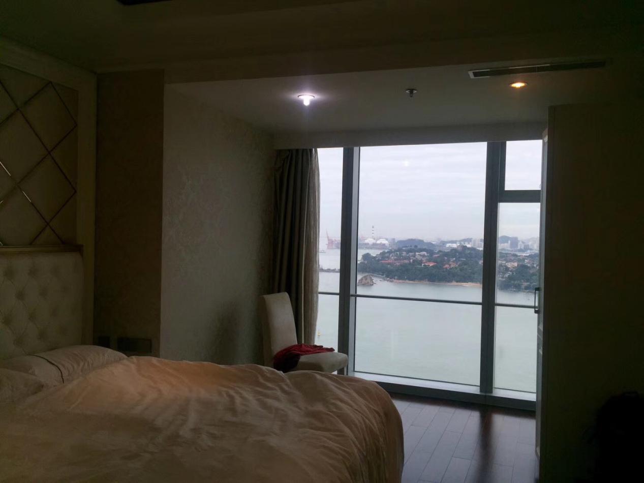 这套房子就在世茂海峡大厦28层,是厦门看风景最棒的海景房,对面就是鼓浪屿。素远在去之前看照片还觉得“没有太大感觉”,但真的到了房间,站在大大的落地窗看对面的时候,才发现鼓浪屿离自己那么的近,“真的是很漂亮的房子。”