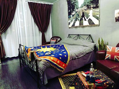 复古的小沙发,墙上的海报,古玛雅的茶几桌布和呼应的地毯,让我对民宿有了新的认识,原来出租屋也可以装修的这么用心。