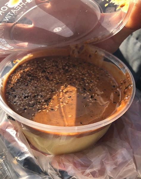 正看照片的时候,三碗面茶已经打包好。房东递给我们一人一碗,说趁热吃好吃。看到街边吃得正香的人们,居然也迫不及待地想尝一尝。我刚拿出勺子准备喝,却被房东拦下了。