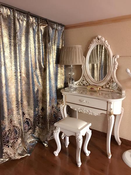 这个梳妆台是我的最爱,欧式的圆镜方凳,深得我的欢心。
