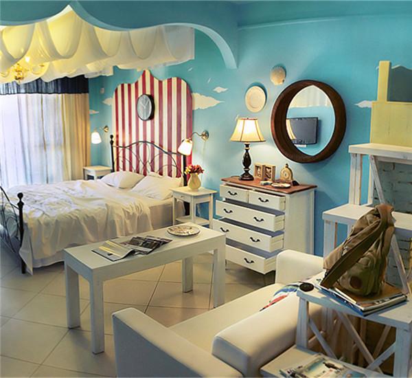 我俩做飞机到了三亚之后,直奔着民宿放行李。一打开民宿门,我觉得我这次选择民宿是非常明智的,整个房间的样子是和在木鸟app上看的效果是一样的,非常浪漫,适合小情侣出门住的一间房。整个房间的背景是蓝色的,台灯、床头桌、床等等都具有巴洛克风格。虽然房间的面积不算大,但是房东布置的非常有情调。