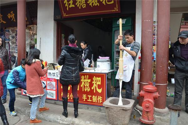 路上听大哥跟我们讲,镇上居住的90%以上都是客家人,说客家话,沿袭客家习俗。果然,大街上上点年纪的老人说的话我们一个字也听不懂。古镇大街上,平整宽敞的石板路、个个紧挨的商铺都在诉说着当时古镇市场之繁荣;别致的造型雕琢、斑驳陈旧的门板,向现代人展示着古镇人的精巧手艺和悠远的历史。